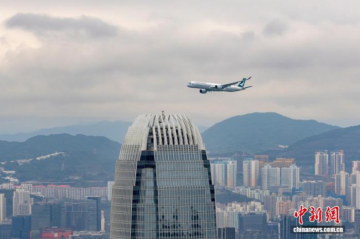 3月30日下午,国泰航空航空公司(Cathay Pacific Airways Inc.这张照片显示了来自国泰航空的一架乘客飞机,该飞机在香港国际金融中心建造附近飞行。国泰航空公司提供的照片